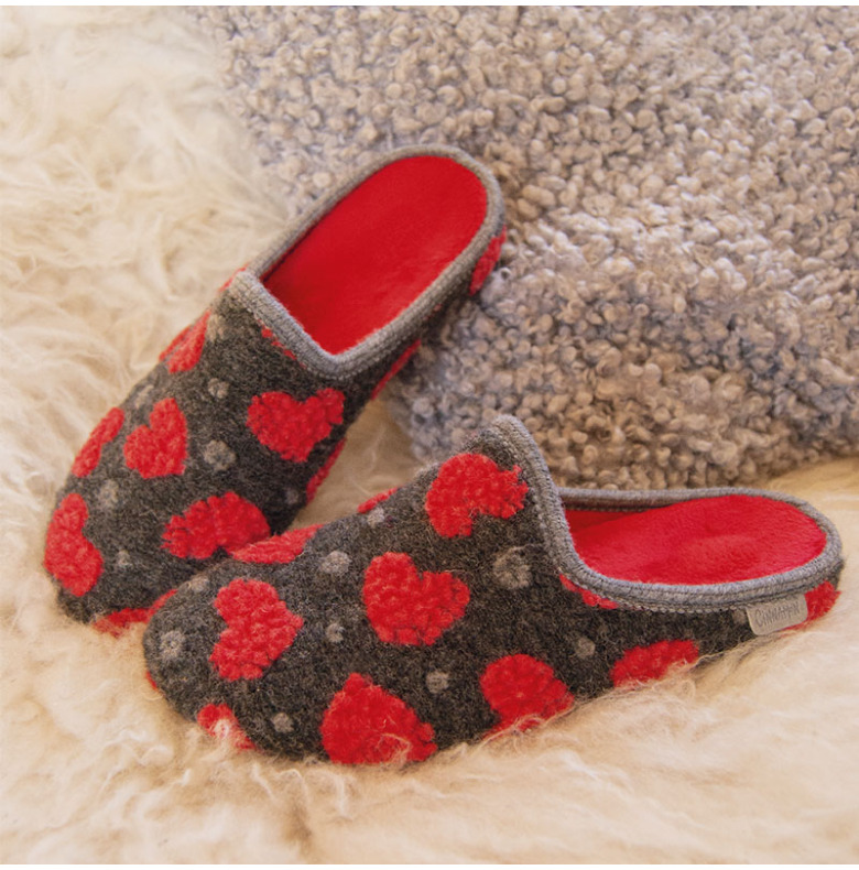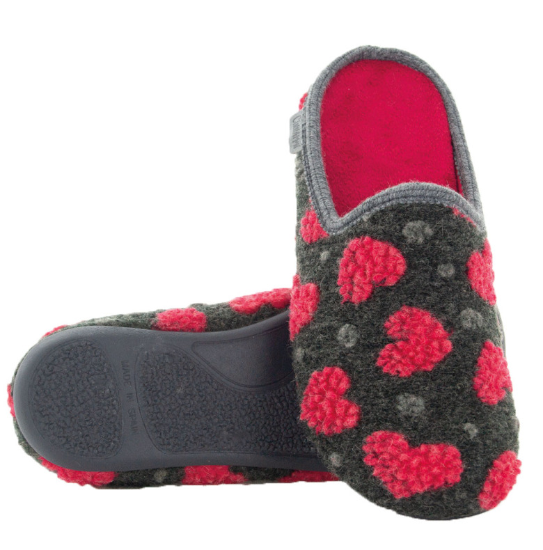 Carmen är en mjuk och värmande slip in-toffel med ett int hjärtmönster med fluffig 3D-effekt. Innersulan går att plocka ur om du vill använda dina egna inlägg.