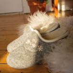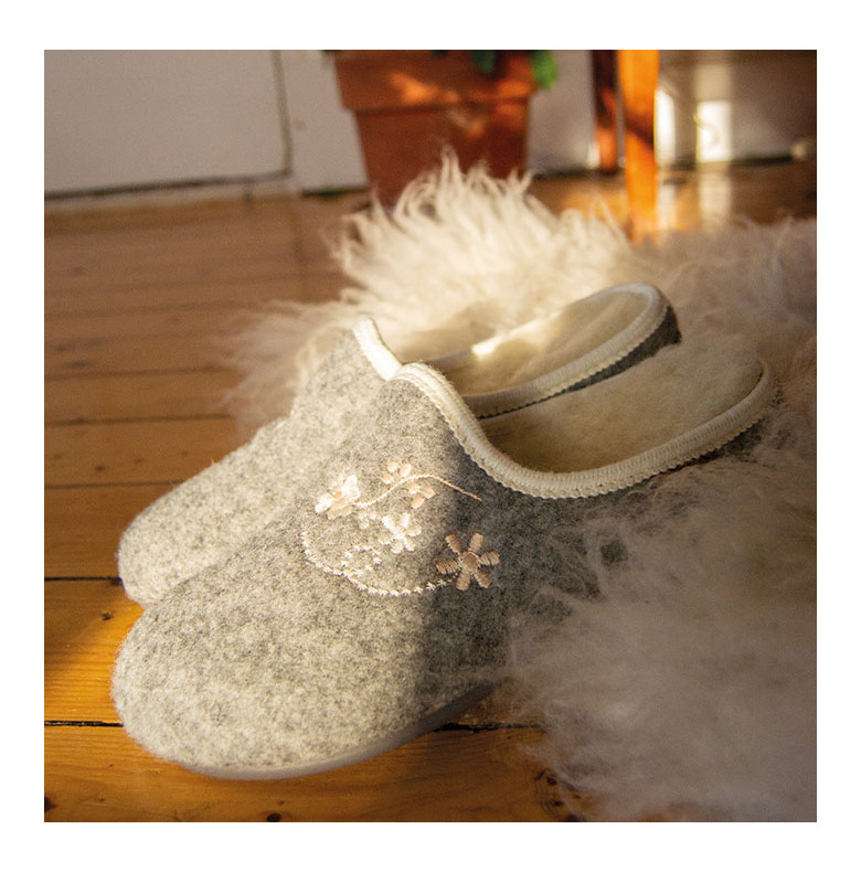 Clarissa är en toffla i ullfilt med ett dekorativt broderi på ovansidan och värmande fluffigt ullfoder inuti. Yttersulan har ett bra grepp mot underlaget och innersulan är uttagbar.