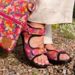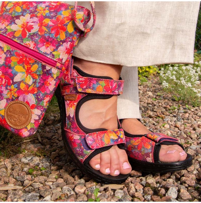 Här ser du en av våra mest populära sandaler i ett vackert ceriseblommigt mönster. Erika är en bekväm och snygg skinnsandal i sportig stil med reglerbara och avklippbara remmar över foten. Hälremmen är avtagbara så att du enkelt kan justera sandalens passform på foten. Du kan också ta bort hälremmen och använda sandalen som en slip in modell om du vill! Innersulan är uttagbar så att du lätt kan ta ur och ersätta sulan med dina egna fotbäddar om du så önskar.