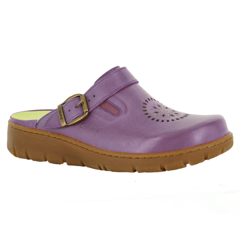 Kiara är en charmig och bekväm sko med en skinnöverdel prydd av luftiga perforeringar i form av en söt blomma, en detalj som ger både stil och ventilation. Här syns Kiara i en härlig lila nyans som sätter färg på varje steg. Den dekorativa remmen ovanpå är inte bara snygg, utan kan även fällas ner och användas som hälrem för extra stabilitet när du behöver det.