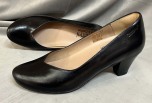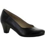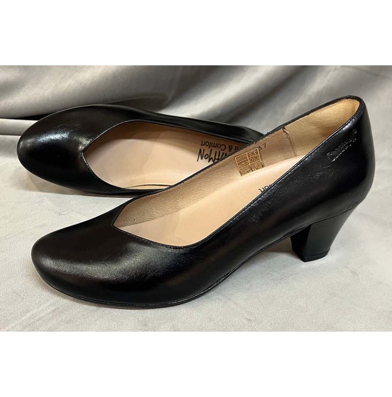 Regina är en skinnpumps med en snygg och stabil klack. Den lilla v-formen över foten blir en snygg detalj samtidigt som den ger en flexibel passform och avlastar om foten svullnar under dagen. Klackhöjden är 5,5 cm och sprängningen (dvs skillnaden mellan höjden fram och bak är 5,0cm). Dessa pumps finns i storlekarna 33-45!