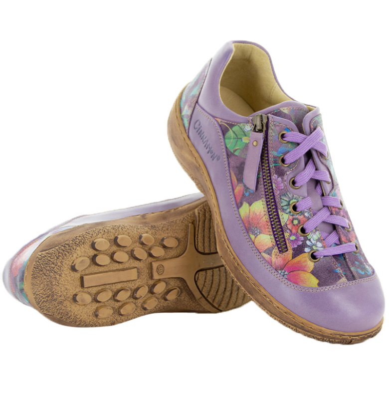 Teresia är en bred och stabil sko som ger dina fötter den komfort de förtjänar men utan att tumma på utseendet. Den praktiska kombinationen av snörning och dragkedja gör den enkel att ta av och på, samtidigt som du får en perfekt justerbar passform. Det vackra lila blommönstret ger skon ett fräscht och personligt uttryck som lyfter varje outfit.